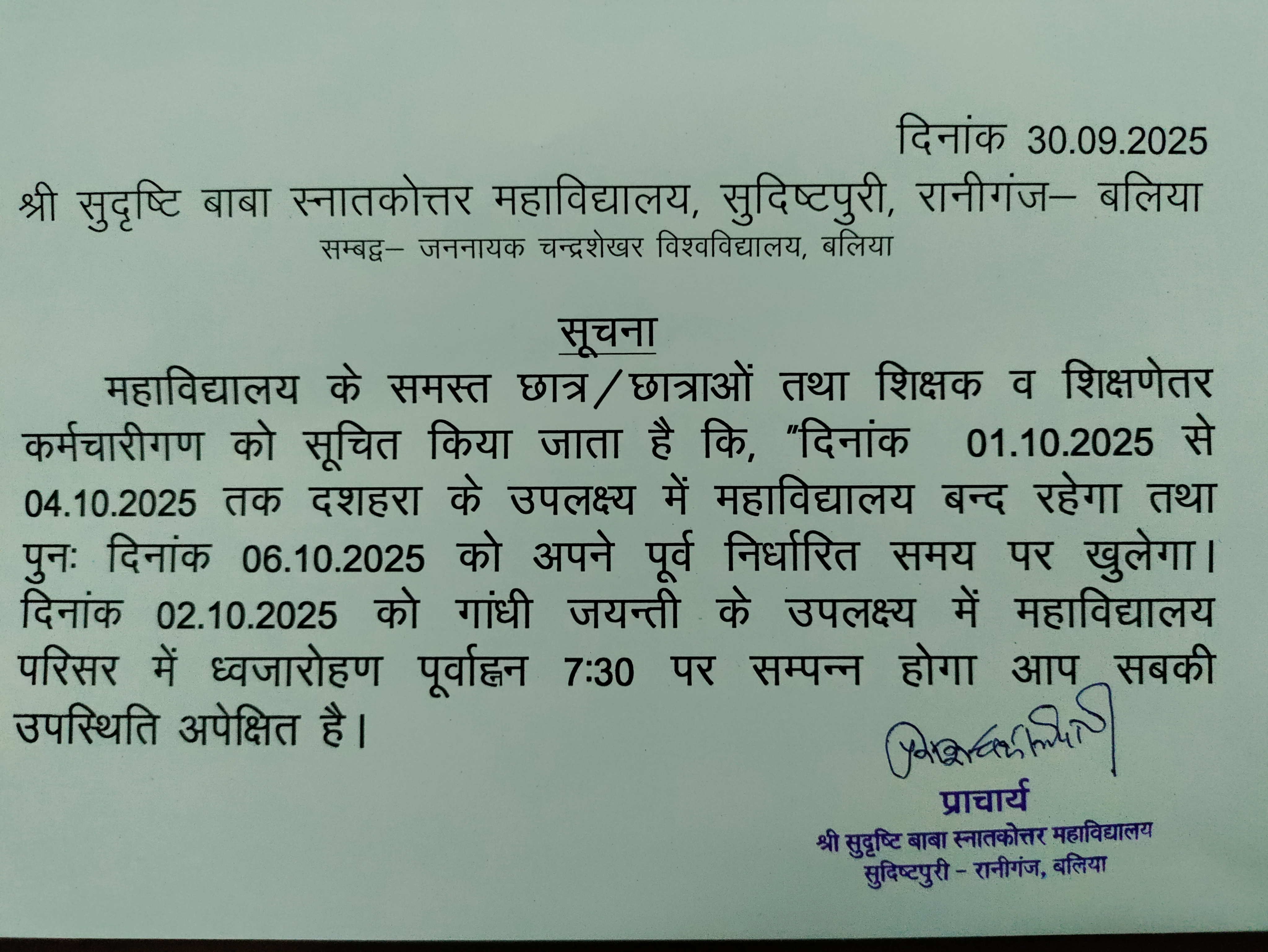 Download Notice for holiday andDashahara holiday and flag hosting 02.10.25