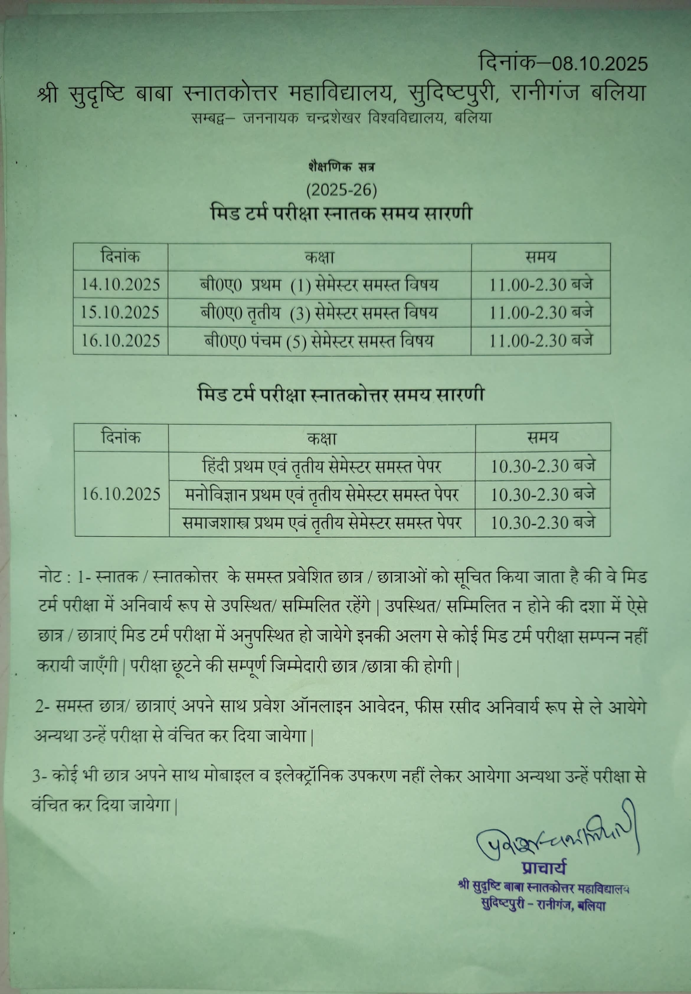 Notice for mid term exam time table session 2025-26