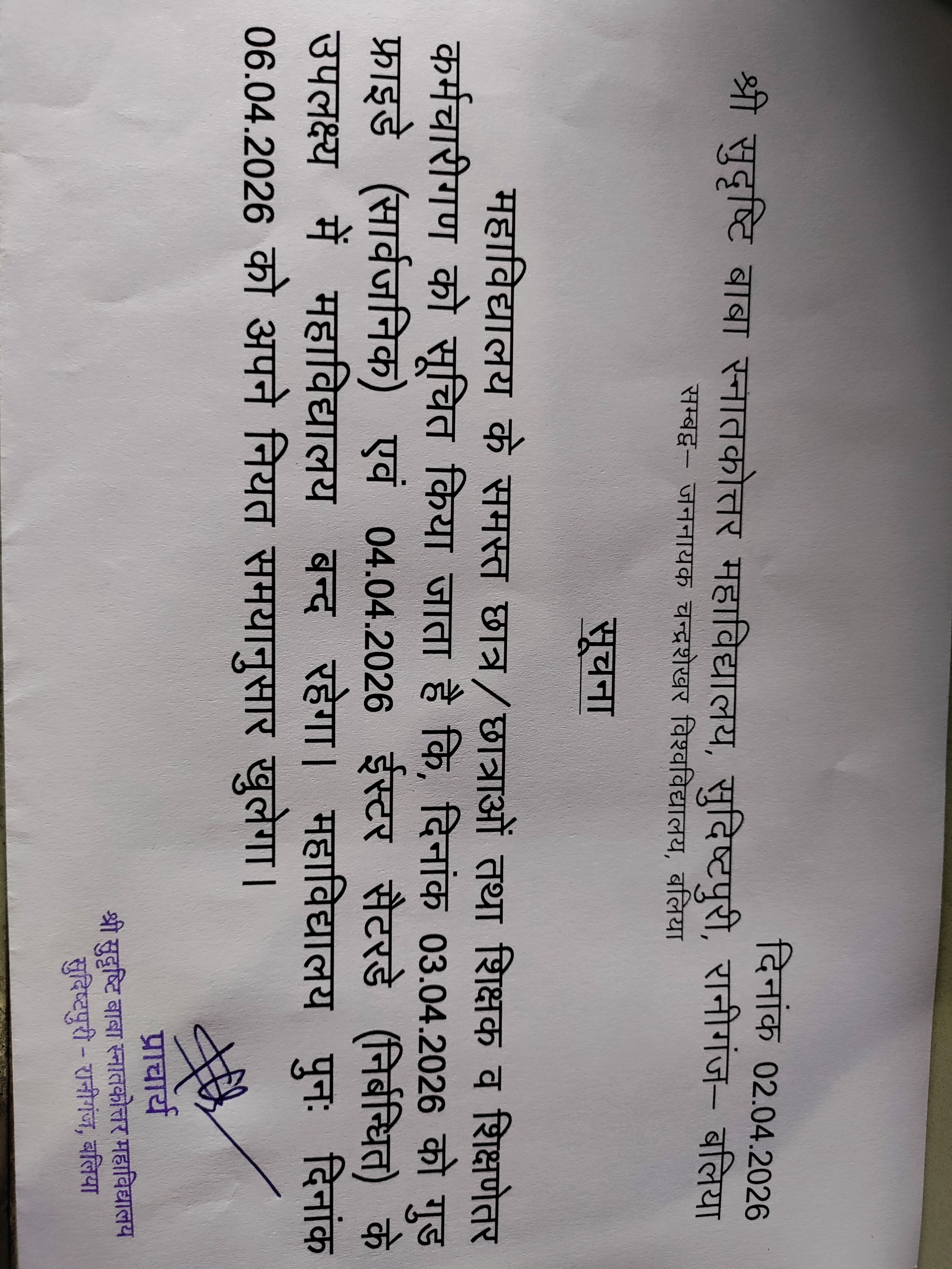 Notice for holidays 03.04.26 and 04.04.26 college open 06.04.26