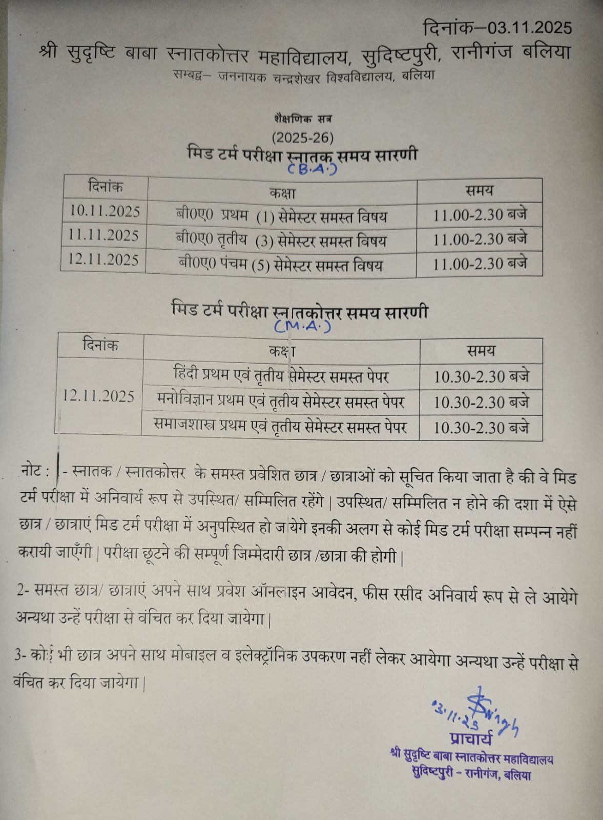 Notice for mid term exam time table session 2025-26