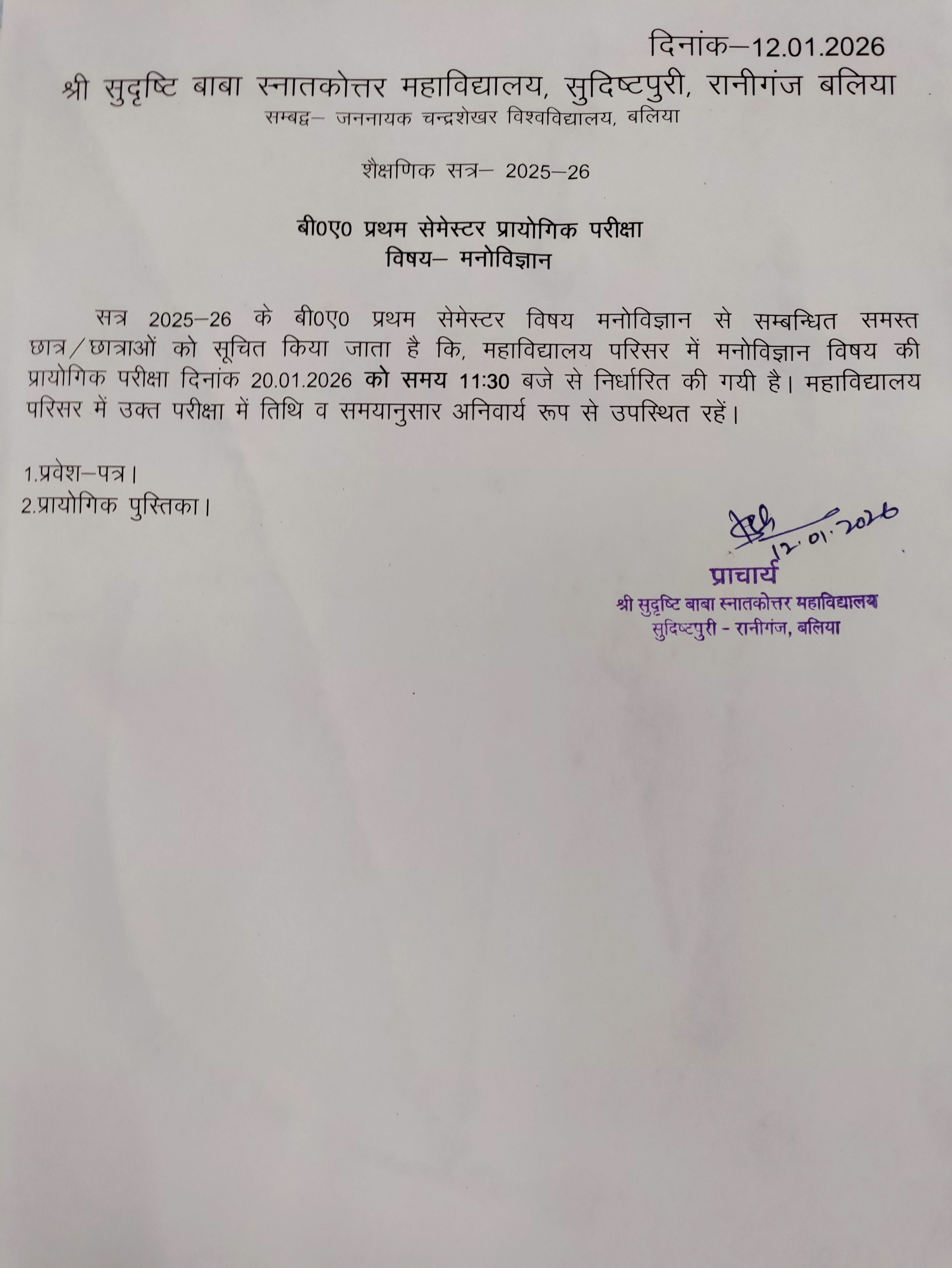 Download Notice for BA 1st semester Psychology practical exam date 20.01.26